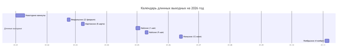 В 2026 году россиян ждет 6 длинных выходных продолжительностью 3 и более дней подряд. Пять из них связаны с государственными праздниками: Новогодние каникулы (9 дней), День защитника Отечества (3 дня), Международный женский день (3 дня), Праздник Весны и Труда (4 дня) и День Победы (3 дня). Шестой длинный уик-энд образуется за счет переноса выходного с 4 января на 4 ноября. Общее количество рабочих дней — 248, выходных и праздничных — 117.