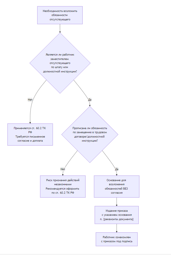 Ключевой риск для работодателя: Если условие о замещении сформулировано некорректно или отсутствует вовсе, любые действия по привлечению к работе без согласия могут быть обжалованы. Работник вправе требовать оплаты этой работы как совмещения или оспорить дисциплинарное взыскание за отказ ее выполнять.