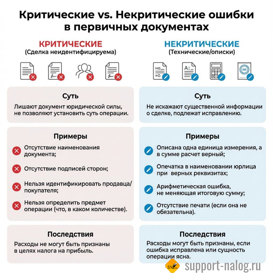 | Примеры | – Отсутствие наименования документа; – Отсутствие подписей сторон; – Нельзя идентифицировать продавца/покупателя; – Нельзя определить предмет операции (что, в каком количестве). | – Описана одна единица измерения, а в сумме расчет верный; – Опечатка в наименовании юрлица при верных реквизитах; – Арифметическая ошибка, не меняющая итоговую сумму; – Отсутствие печати (если она не обязательна). |